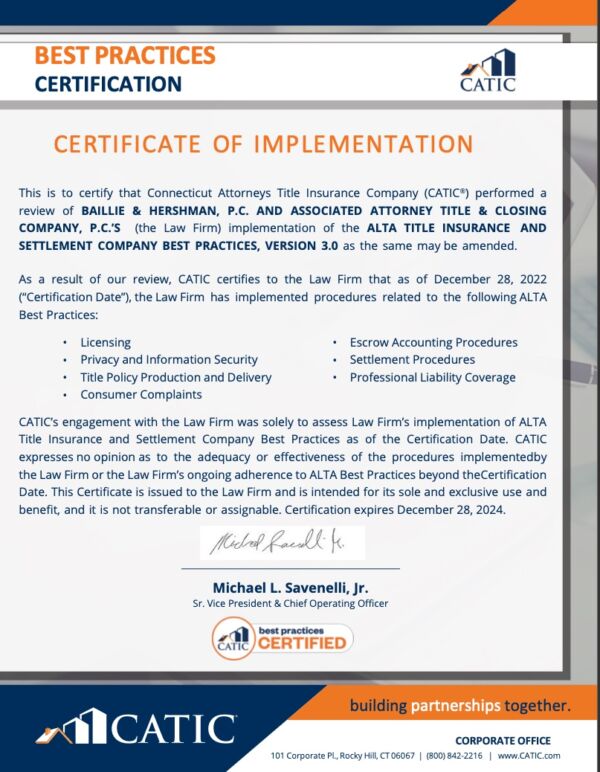 Connecticut Attorneys Title Insurance Company (CATIC®) has reviewed and certified Baillie & Hershman, P.C. and Associated Attorney Title & Closing Company, P.C. for implementing procedures related to ALTA Best Practices. These procedures include Licensing, Privacy and Information Security, Title Policy Production and Delivery, Consumer Complaints, Escrow Accounting Procedures, Settlement Procedures, and Professional Liability Coverage.